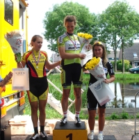 De volgende morgen in Gouda uitten ik die frustratie in een prima wedstrijden. Net voor de helft van de koers wisten we met 9 dames weg te rijden. Zelf probeerde ik in de finale weer uit deze groep weg te komen. Met de sterke Engelse sprinter Eileen Roe aan boord in de kopgroep leek het me niet handig het op de sprint aan te laten komen. Wegkomen lukte zowel mij als mijn ploeggenoten Henriette Woering niet. Wel kwam mijn voorspelling uit.. Eilleen Roe wist als eerste de finish lijn te passeren. Pas een meter voor de finish kwam ze langs mij gezeild en mocht ik haar dus wel op plek 2 op het podium vergezellen!
